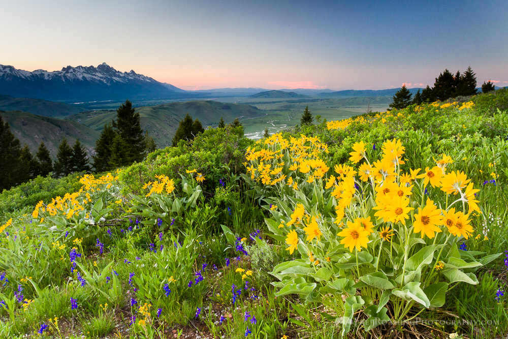 Last week I headed up to the summit of Snow King to get the last of the balsamroot before they began to die off, as well as on the other side of the mountain along the Josie’s Ridge trail. The shots I got from Josie’s Ridge didn’t come out quite as nice as I had hoped sunset would offer from there, but I was happy with some of the shots from up top of the mountain. One such shot was around dusk overlooking the National Elk Refuge and Jackson Hole. Hopefully the snow begins to melt much quicker so I can start getting higher up in the Tetons soon!