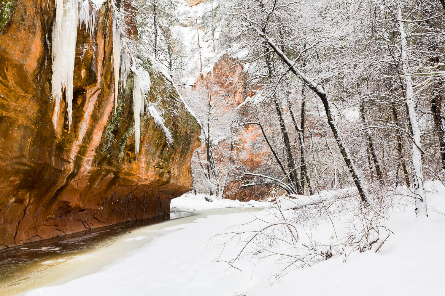 It’s a rare site to see the West Fork Trail, north of Sedona, Arizona in Oak Creek Canyon, converted to such a winter wonderland. A thick snow as shown happens only a few times a year at most. The quietness of the entire area increases exponentially with a storm like this. Not even the highway noise nearby can get through the snow and canyon walls of Oak Creek Canyon.