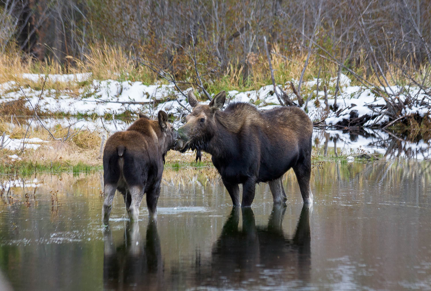 This is probably going to be my last post before leaving on my four-week road trip around the west. While the black bears along Moose-Wilson Road weren’t out, this cow moose and her calf were just up the road. I stopped for a while when I wasn’t able to find the bears and got a few shots of these two as they ate, drank and showed their affection for each other.